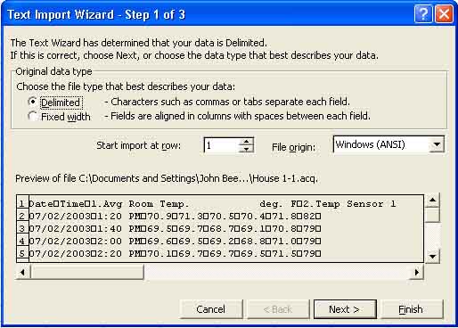 The following dialogue box is the first of three step to import your data into Excel